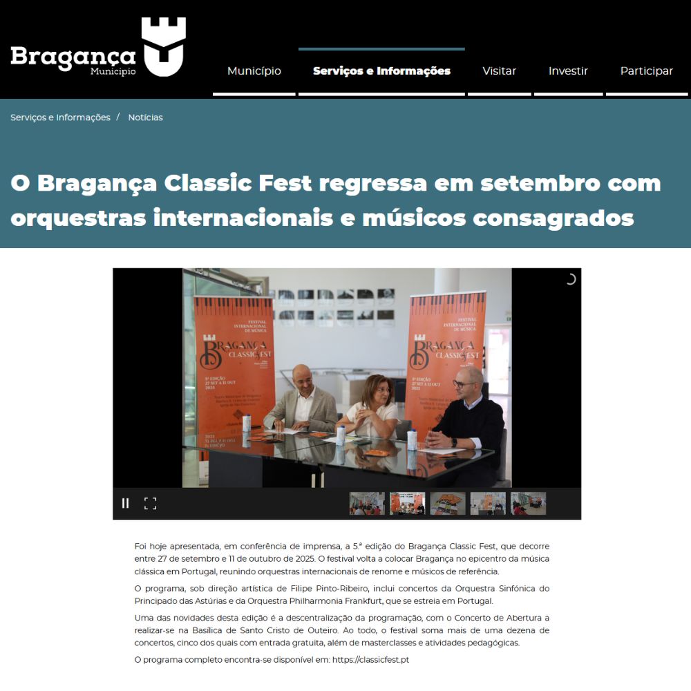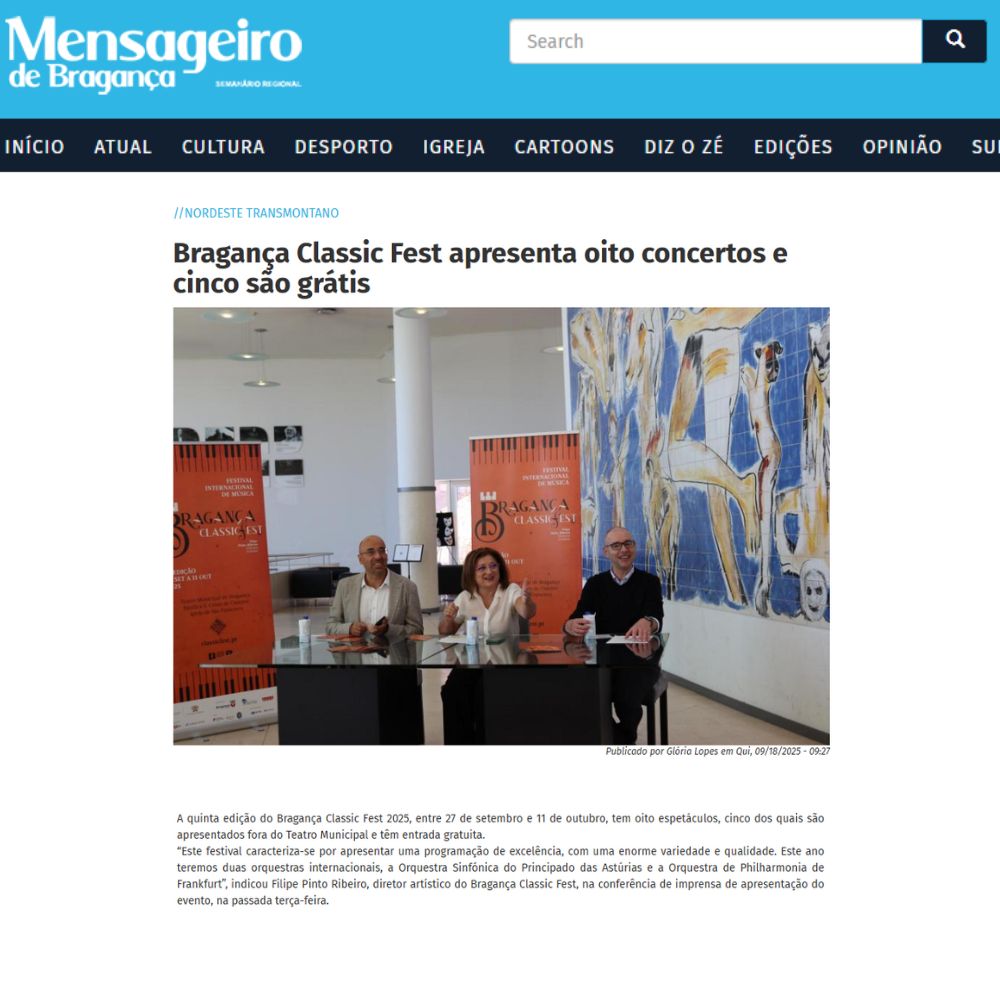 “Foi hoje apresentada, em conferência de imprensa, a 5.ª edição do Bragança Classic Fest, que decorre entre 27 de setembro e 11 de outubro de 2025. O festival volta a colocar Bragança no epicentro da música clássica em Portugal, reunindo orquestras internacionais de renome e músicos de referência.