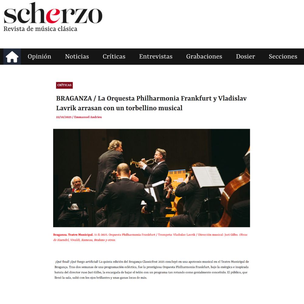 “ ¡Qué final! ¡Qué fuego artificial! La quinta edición del Bragança ClassicFest 2025 concluyó en una apoteosis musical en el Teatro Municipal de Bragança. Tras dos semanas de una programación ecléctica, fue la prestigiosa Orquesta Philharmonia Frankfurt, bajo la enérgica e inspirada batuta del director ruso Juri Gilbo, la encargada de bajar el telón con un programa tan rotundo como genialmente concebido”